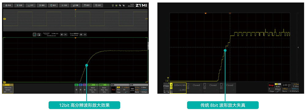 与传统的8位ADC(256个量化等级)相比,ZUS5000系列示波器采用的12位ADC具备4096个量化等级,其细节还原能力是8位架构的16倍。在对采集波形进行局部放大观察时,12位ADC能够有效规避阶梯状失真,确保波形平滑且细节特征清晰可辨。