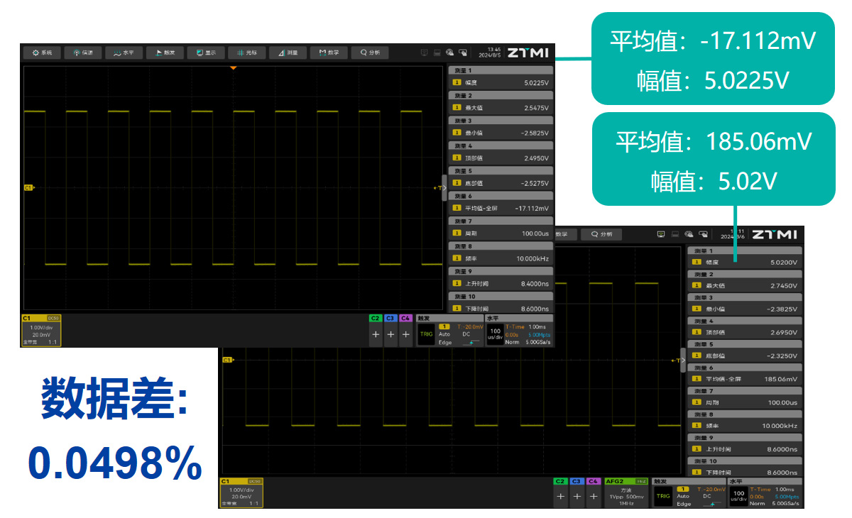 ZUS5000系列示波器搭载了深层优化的抗噪测量专利算法。通过对真实高噪声环境的模拟测试显示: