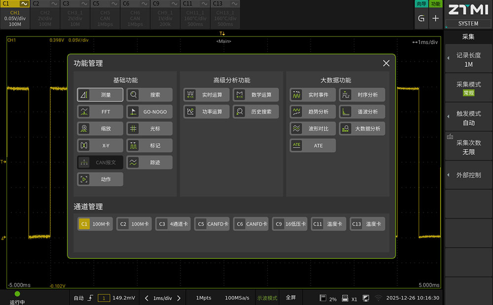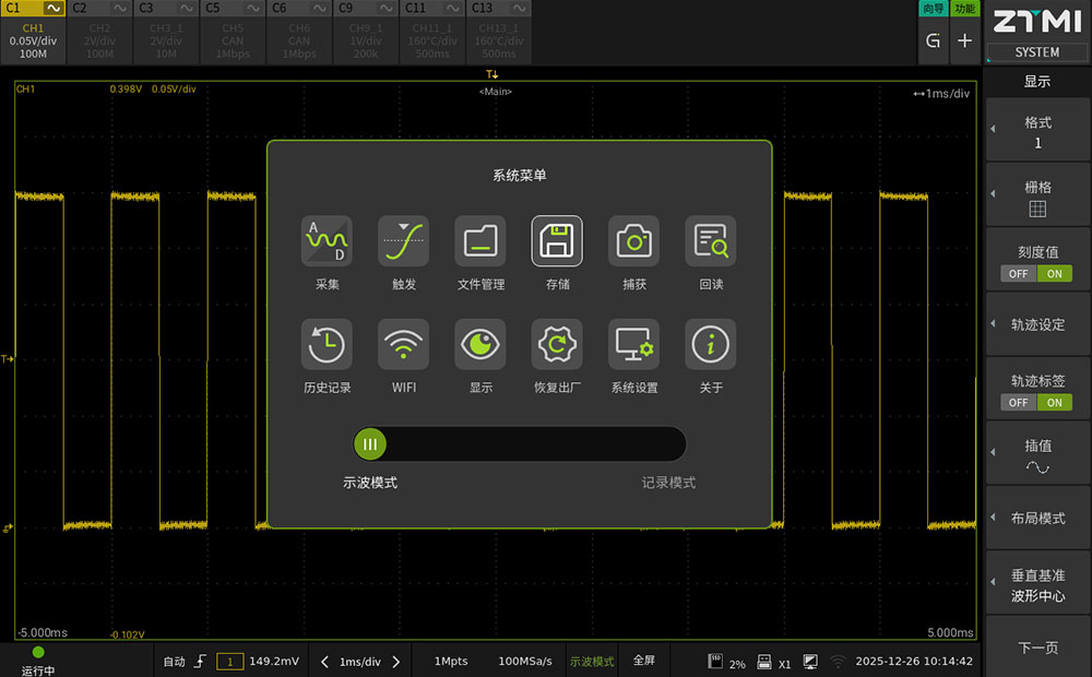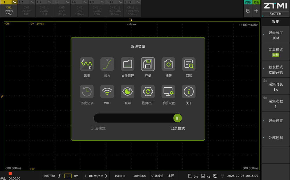 ZDL6000通过底层软件架构的优化,实现"示波器"与"记录仪"两种工作模式的独立运行。用户通过触屏界面的滑条即可进行功能切换,适应不同的测试阶段。