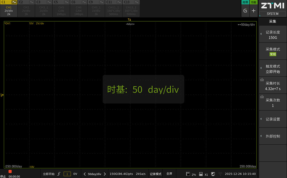 通过向右滑动界面进入记录模式(如图5)。在此模式下,设备启用实时流盘技术,配合机身存储,可实现最长500天的连续无间断记录。这种全数据记录方式避免死区时间,确保存储期间的所有信号波动均可事后追溯。