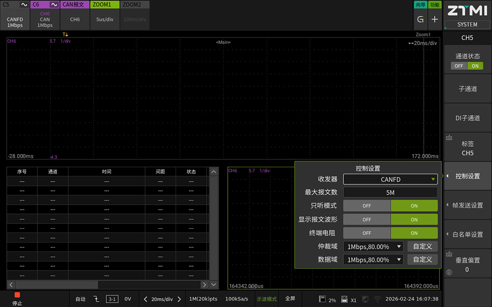 1. 通道设置:支持设置CAN/CAN FD收发器类型、最大报文数及只听模式。针对CAN FD模式,系统允许用户精细化配置仲裁域和数据域的波特率及采样点。