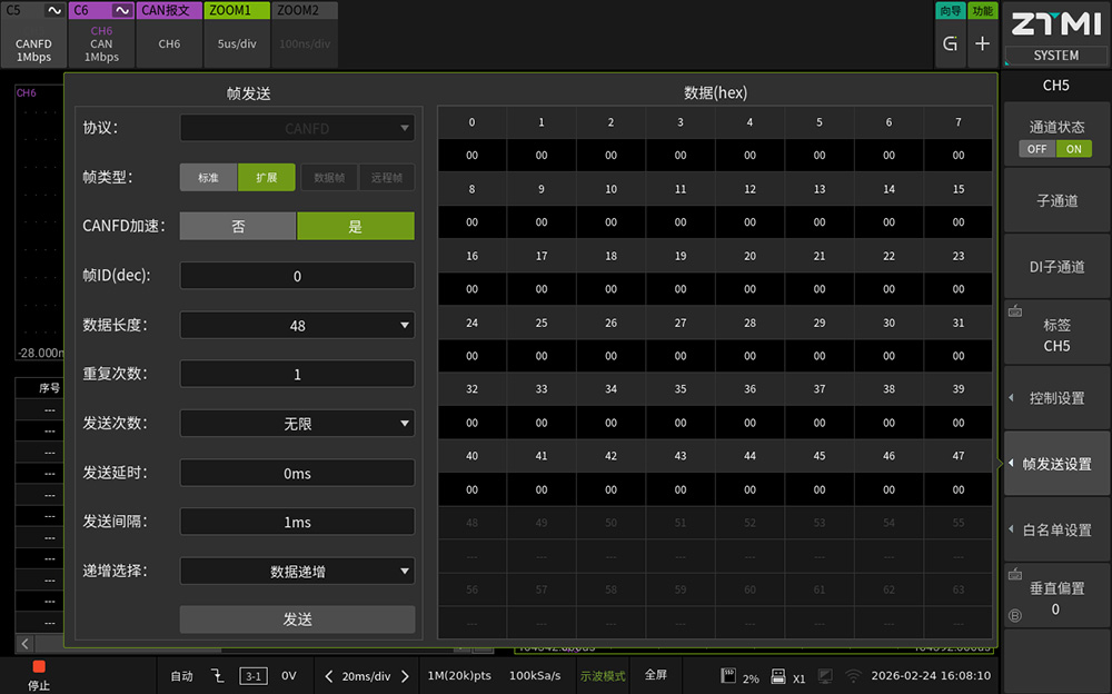 2. 发送机制:内置帧发送配置界面,可定义帧ID、数据内容、发送次数、重复周期及时间间隔等。通过在一路配置发送而另一路配置接收,即可在同一设备内完成闭环的功能验证。