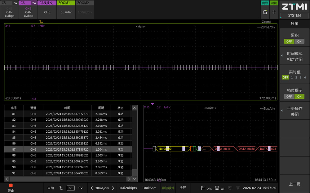 ● 同轴分析:CAN报文解析后的内容与实际物理波形将展示在同一时间轴上,协助研发人员直接定位总线异常点位与电信号波形质量(如电磁噪声、反射、过冲等)的因果联系。