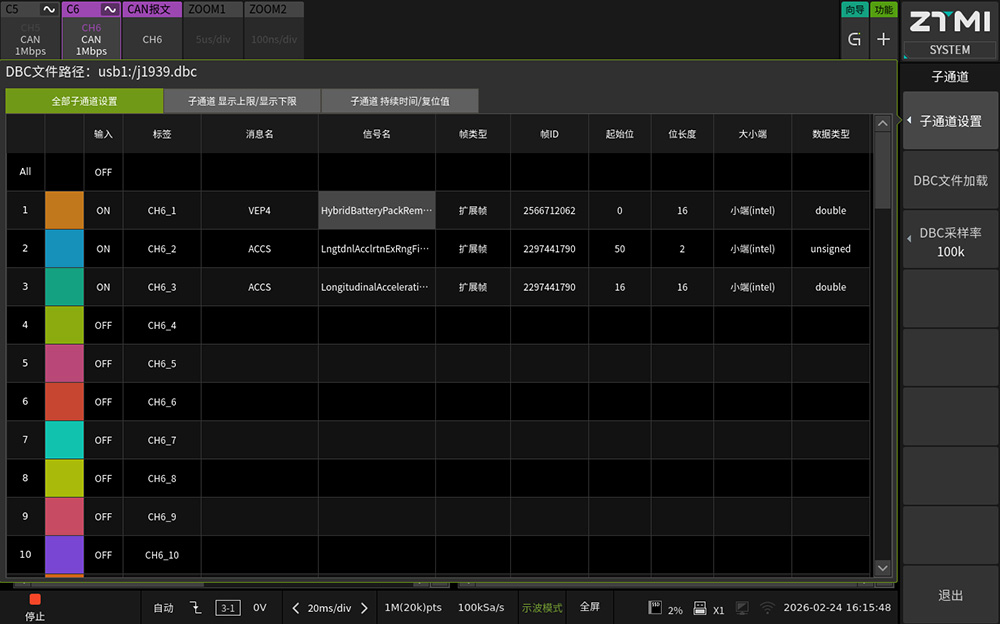 ● 子通道机制:每一路CAN通道均提供60个虚拟子通道,专门用于关联DBC文件中的信号参数。
